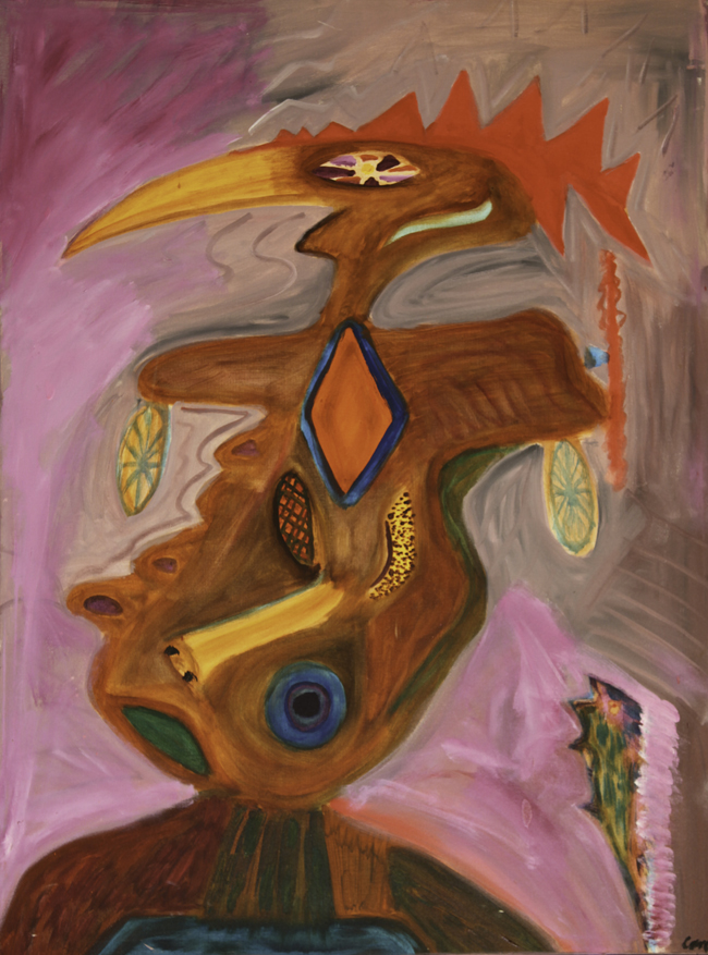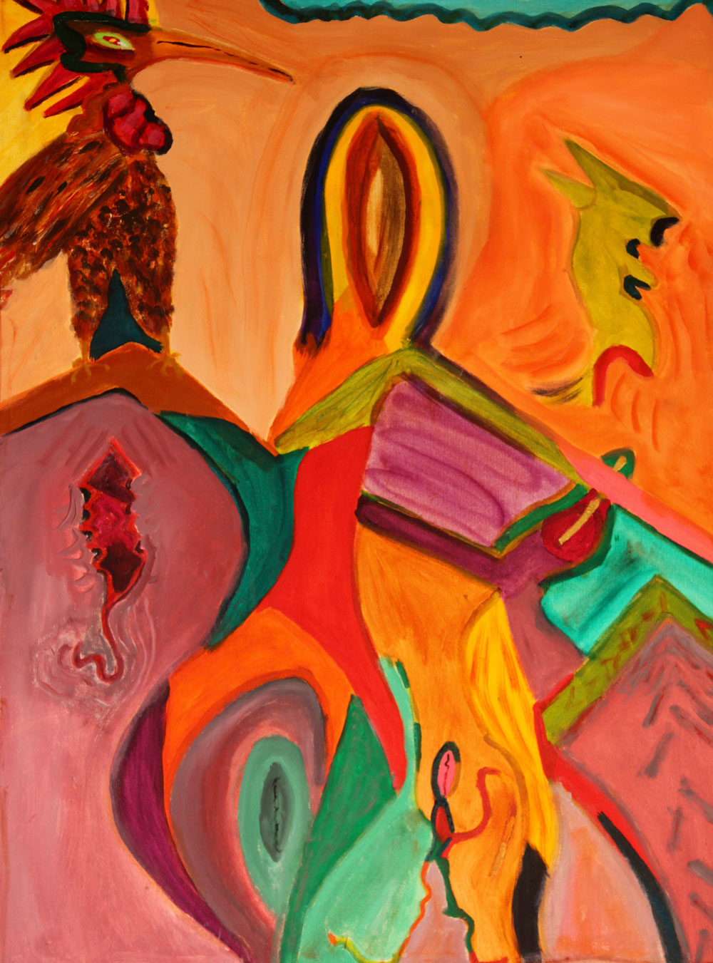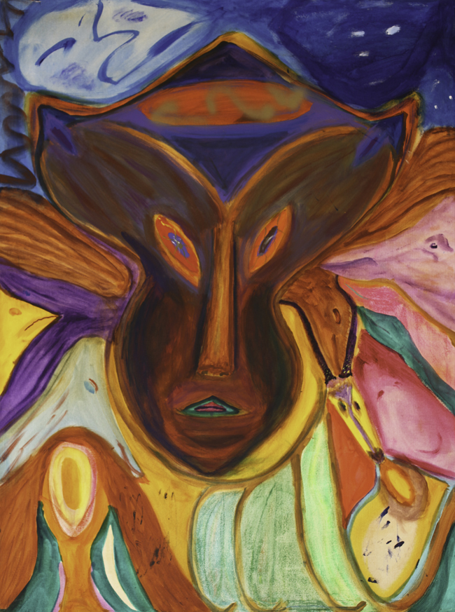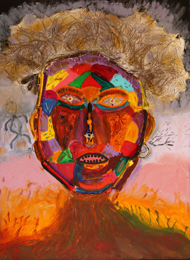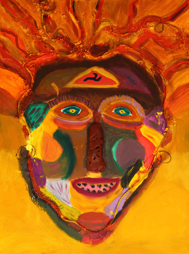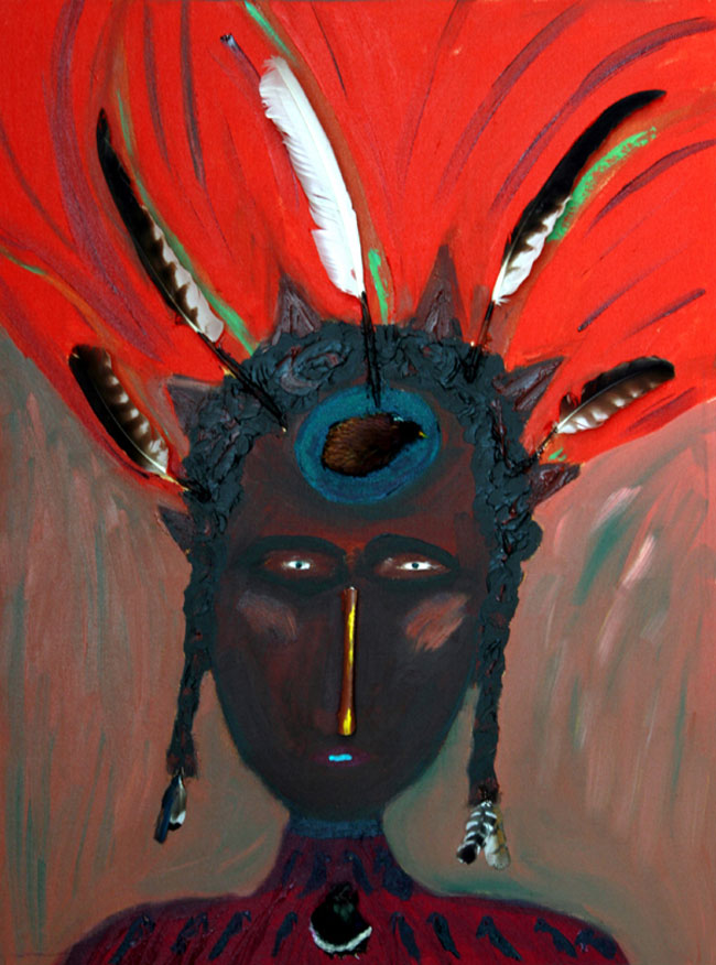 I share with you my delight of color, love of bones, “bright shining as the sun”, feathers, laughter and wonder at the beauty of this world and those unseen. The profane and sacred twirl together with humor and play. The Shaman Mask paintings are portals to other realities. I invite you to dance with me in awe of the Universe, eyes twinkling.